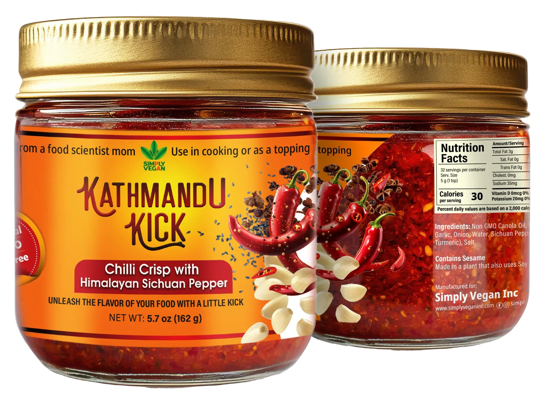 Take your tastebuds on a trip to the Himalayas with Kathmandu Kick, a handcrafted chilli crisp infused with the vibrant heat of Himalayan Sichuan pepper, golden turmeric, toasted sesame, and layers of savory garlic, onion, and ginger.