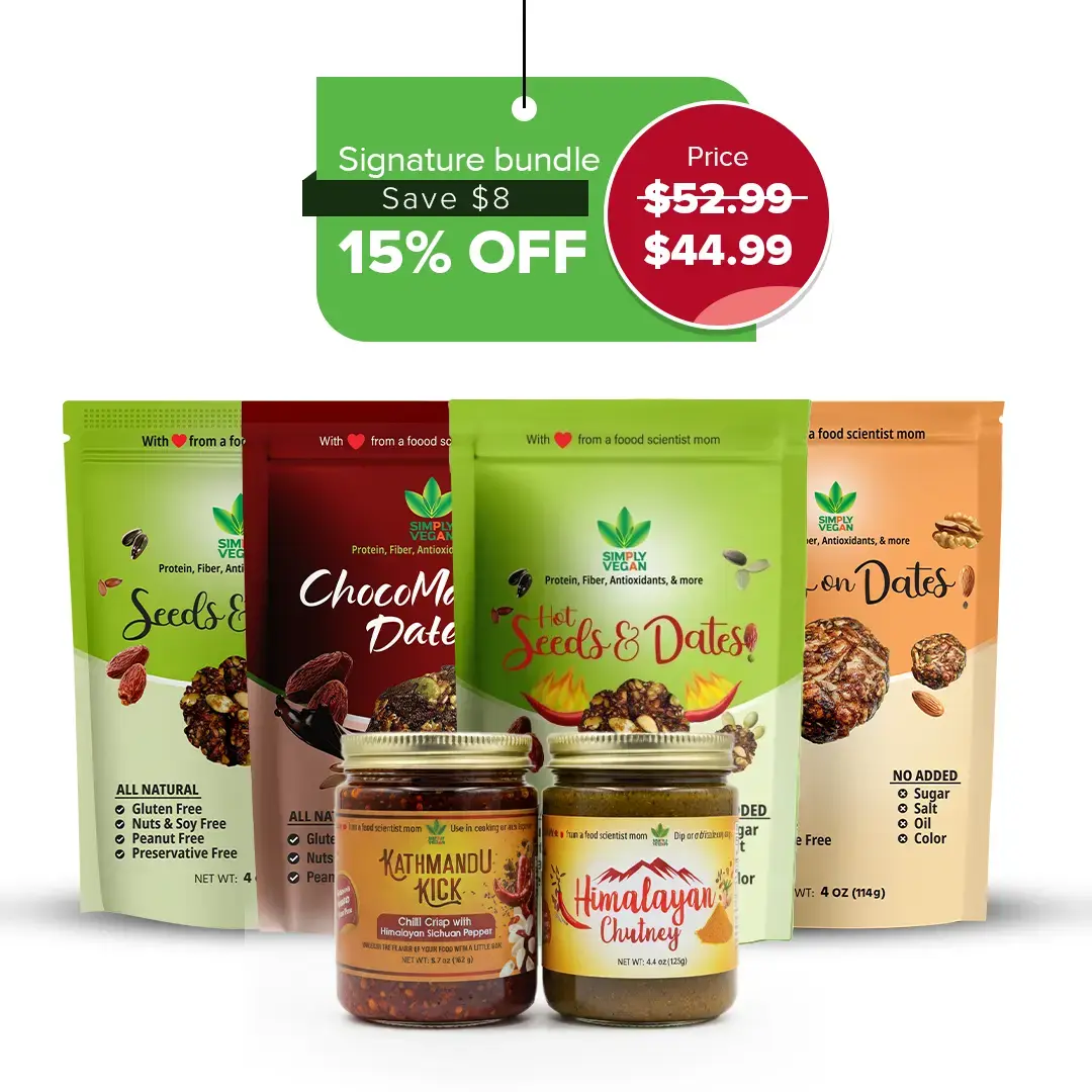 Experience everything Simply Vegan has to offer. This premium bundle includes our two signature condiments (Kathmandu Kick & Himalayan Chutney) and a full 4-pack of our assorted date and seed snacks.